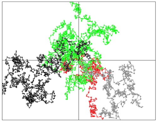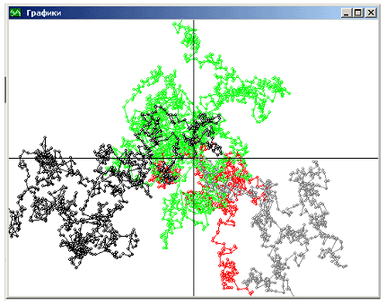 Соответствующий момент времени будет Эксперимент на модели в среде Delphi Для получения типичных траекторий броуновской частицы проведем расчет четырех траекторий для l = 1 по одной, меняя их цвет. На рис. 7.1 показаны результаты этого численного эксперимента. Обратите внимание на то, какие сложные и неповторяющиеся траектории получаются.
