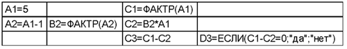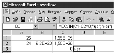 Примечание. На всякий случай напомним читателю, что запись n!, в математике называемая “красивым” термином “факториал”, есть просто произведение последовательных целых чисел от 1 до n. Например, 5! = 120. Аккуратно внесем формулы в электронную таблицу, и Excel послушно подтвердит, что все правильно, написав “да” в ячейке D3. А если взять другое число, допустим, 25? К нашему удивлению, появится результат, изображенный на рис. 2.1.
