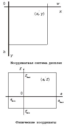 Рис. 3.1 Тем не менее получить формулы масштабирования для перевода физической величины в координаты пикселей дисплея не очень сложно. Выведем, пользуясь рисунком, формулы для пересчета физических координат a и f (аргумент и функция) в экранные x и y для некоторой произвольной точки. Определим сначала физические размеры окна, которое будет отображаться на экране:
