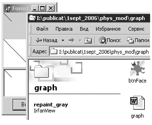 Рис. 3.2 На ней отчетливо видно, что части линий, которые были закрыты окном, на самой форме (вверху) и на компоненте ListBox1 (внизу) исчезли, тогда как компонент Image1 заботливо восстановил свое содержимое. Вывод очевиден: для целей рисования нам лучше всего подходит компонент типа Image. Примечание. Строго говоря, некоторый механизм “самовосстановления” рисунка на холсте в Delphi предусмотрен. Для этого можно программу рисования поместить в обработчик события OnPaint (он есть не у всех компонентов, но у формы такое событие существует). В этом случае после перерисовки компонента Windows передаст управление вашему обработчику и тот восстановит рисунок на холсте. Для наших физических применений данный механизм абсолютно неприемлем, поскольку он потребует при каждой перерисовке окна пересчитывать все графики! Итак, в качестве холста для рисования графиков мы выбираем компонент типа Image. Очень удобно свойству выравнивания Align установить значение alClient — тогда наш компонент будет всегда автоматически растягиваться на всю площадь окна. .0Проблема 3. Как построить график? Первый вывод, касающийся способа рисования графиков, для физических задач довольно очевиден: строить график рассчитываемой величины удобнее всего по точкам. В Delphi имеется для этого хорошо подходящий для этого механизм: объект Canvas содержит в себе свойство Pixels, представляющее собой массив, образующий рисунок пикселей. Поставить точку — значит присвоить элементу массива необходимое цветовое значение типа TColor, например: Image1.Canvas.Pixels[x,y] := clBlack; В приведенном операторе x и y — координаты точки экрана, а значение константы clBlack обозначает черный цвет (первые две буквы подчеркивают то обстоятельство, что это именно цвет — color). Кодирование цветов в Delphi заслуживает того, чтобы о нем рассказать подробнее. Стандартные 16 цветов, как мы уже видели на примере черного, имеют специальные имена, начинающиеся с префикса “cl”. Их названия приведены в таблице.
