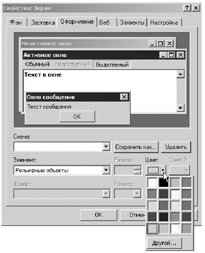 Небольшим темным пятном на фоне полной ясности в стандартных цветах служит тот факт, что в Windows их почему-то не 16, а 20. Причем, как написано в книге [9], “Когда Windows сбрасывает системную палитру, то он загружает стандартные цвета в первые 10 и последние 10 позиций. Каждое окно всегда может рассчитывать на эти 20 цветов независимо от того, какие цвета загружены в оставшуюся часть системной палитры”. Разумеется, можно определить и свой собственный RGB-цвет, как показано ниже. const clMyColor = TColor($FFFBF0); И еще об одной особенности определения цветов в Delphi. Если посмотреть на установленный по умолчанию цвет формы, то он, как ни удивительно, не совпадет ни с одним из перечисленных выше стандартных цветов: в графе color вы найдете весьма необычную надпись clBtnFace (цвет лицевой стороны кнопок). Этот и множество других имеющихся в списке цветов (clActiveCaption, clInactiveCaption, clMenu, clWindow, clWindowFrame и др.) берутся из цветовых настроек Windows. Если не боитесь на время увидеть на экране своего дисплея сильно “испорченную” цветовую гамму, можете провести следующий эксперимент. Обычным образом (правой кнопкой щелкнуть по Рабочему столу и выбрать в меню Свойства) перейдите к настройкам свойств экрана. На вкладке Оформление щелкните по рисунку кнопки; в ответ на это Windows сообщит, что он готов к настройке “рельефных объектов”. Щелкните по выпадающему списку Цвет, и появится стандартная цветовая палитра из 20(!) цветов, причем по умолчанию выбран серый (именно такой цвет имеет левый нижний квадратик). Если щелкнуть по соседнему справа цвету, то после нажатия традиционного OK все кнопки, а с ними и множество элементов окон, окрасятся в изумительный голубоватый оттенок (и это еще один из самых спокойных цветов!).