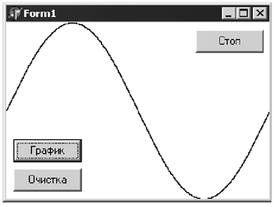 Рис. 3.3 Прежде чем восстановить цветовую гамму, не забудьте открыть Delphi и убедиться в том, что там тоже поменялись цвета. Теперь попытаемся вернуть цвета в старую добрую цветовую схему. Не тут-то было! Установка старого цвета рельефных объектов вернет назад не все цвета! Остается в списке Схема выбрать значение Стандартная — только тогда буйство красок окончательно исчезнет. Таким образом, если только вы не хотите, чтобы ваше приложение меняло окраску в соответствии с не всегда здоровыми цветовыми вкусами пользователей Windows, устанавливайте стандартные значения цветов, перечисленные в приведенной выше таблице. Теперь, когда мы в теории поняли, как можно рисовать цветные графики, перейдем к их построению на практике. Для простоты выберем “классическую” функцию y = sinx и попытаемся нарисовать ее график так, чтобы он занял всю отведенную ему площадь окна. Поместим на форму компонент Image1 и установим ему свойство Align = alClient, чтобы он занял всю рабочую площадь окна. Затем добавим еще три кнопки: Button1, Button2 и Button3, первая из которых будет инициировать построение графика, вторая — очистку окна, а третья — принудительно прекращать вычисления. Займемся пока первой кнопкой. Добавим в ее обработчик события OnClick следующую программу: procedure TForm1.Button1Click(Sender:TObject); const da=0.001; var x,y,w,h:integer; a,p:double; begin w:=Image1.Width; h:=Image1.Height; a:=0; p:=2*pi; while a<p do begin x:=round(w*a/p); y:=round(h*(1-sin(a))/2); Image1.Canvas.Pixels[x,y]:=clBlack; a:=a+da; end; end; В ней нетрудно найти уже знакомые нам