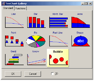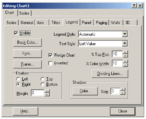 Рис. 3.7 Обязательно обратите внимание на следующую деталь. При появлении окна флажок 3D в нижней части окна выбран, так что картинка изображает трехмерные варианты графиков. Для физических целей плоских вполне достаточно, и, прежде чем снять с экрана приведенную в статье картинку, данный флажок был сброшен. Конечно, при рисовании может быть использован любой из имеющихся типов, но мы воспользовались последним: он называется bubble (в переводе с английского — “пузырек”) и наносит на плоскость точки в виде кружков заданного радиуса и цвета. Обратите внимание, что после обычного завершения диалога нажатием OK в окне редактора появится серия Series1. Прежде чем закончить с ней работу, установим несколько свойств, что позволит увеличить место, занимаемое графиком, путем отказа от всяческих подписей и пояснений. Делается это несложно. Щелкнем по закладке страницы Legend (“легенда”, или по смыслу лучше “обозначения”) и сделаем ее невидимой путем сброса флажка Visible (видимая) — см. рис. 3.8.