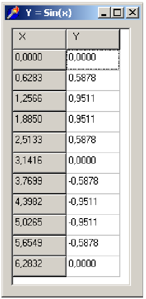 Рис. 3.11 На ней не только предусмотрено место для данных с возможностью прокрутки, но и даже выделенные серые клеточки для оформления подписей строк и колонок (данные столбцы и колонки в Delphi называются fixed — фиксированными, и их число легко регулируется заданием значений свойств FixedCols и FixedRows). Для организации доступа к таблице в ней предусмотрено специальное свойство Cells, представляющее собой обычный (строковый!) двумерный массив. Первый индекс обозначает номер столбца (координата x), а второй — строки (координата y); нумерация начинается с нуля, фиксированные ячейки учитываются. Например, запись Cells[1,2] адресуется к ячейке во втором столбце и третьей строке (на рис. 3.11 она находится непосредственно под выделенной темным цветом клеткой). Приведем пример простой программы заполнения таблицы. Как и для демонстрации графических возможностей, обратимся к простой функции sin x и “затабулируем” ее на отрезке, равном периоду. Договоримся для простоты разбить отрезок на 10 равных частей. Решение сформулированной задачи реализуется следующим несложным образом. На форму помещается компонент StringGrid1, затем двойным щелчком по свободному месту формы создается обработчик события OnFormCreate. Далее в него вписывается следующая программа. procedure TForm1.FormCreate(Sender: TObject); const n=10; var x,y,h:double; i:integer; begin with StringGrid1 do begin ColCount:=2; Cells[0,0]:=' X'; Cells[1,0]:=' Y'; end; h:=2*pi/n; for i:=0 to n do begin x:=i*h; y:=sin(x); with StringGrid1 do begin if i+1=StringGrid1.RowCount then{добавить строку} RowCount:=RowCount+1; Cells[0,i+1]:=FloatToStrF(x,ffFixed,5,4); Cells[1,i+1]:=FloatToStrF(y,ffFixed,5,4); end end end; Программа достаточно проста. Сначала формируется таблица из двух столбцов (по умолчанию Delphi устанавливает больше) и ее “шапка”. Затем вычисляются значения функции sin x для 11 точек (обратите внимание, как организован вычислительный процесс через индексную переменную i!) и заносятся в соответствующие клетки таблицы. Важно подчеркнуть, что видимых на экране ячеек в какой-то момент перестанет хватать, тогда предусмотренный в теле цикла условный оператор аккуратно будет добавлять по одной строке по мере надобности. Особо хочется сказать о функции FloatToStrF, которая позволяет не только выполнить требуемое для таблицы преобразование числа в строку, но и установить при этом его формат. Мы выбрали представление с фиксированным размещением запятой и отобразили после нее 4 знака. В результате на экране появилась вполне симпатичная табличка (рис. 3.12).