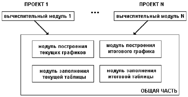 Рис. 3.12 Таким образом, работа с таблицей оказывается в среде Delphi простой и удобной. Наличие хорошо проработанного стандартного компонента позволяет не особенно задумываться над табличным представлением результатов и полностью сосредоточить свое внимание на организации вычислений. Примечание. В программах, разработанных в Delphi, при вводе дробных чисел в поля компонентов целую и дробную части следует разделять символом, который определяется национальными настройками ОС Windows, а именно: в русской версии необходимо использовать запятую, а в английской — точку. Для языка программирования подобное решение проблемы кажется несколько непоследовательным (согласно их синтаксису, в вещественных числах всегда однозначно используется точка); тем не менее, если вспомнить электронные таблицы Excel, то там тоже имеет место аналогичный “двойственный” подход. Общая структура практикума (пакета программ) Обсудим теперь проблемы структуры нашего программного комплекса для моделирования нескольких физических задач; для краткости будем называть всю совокупность программ практикумом, а каждую входящую в него задачу проектом (последний термин напрямую заимствован из Delphi). Будем считать, что моделирование типичной школьной физической задачи в среде Delphi протекает следующим образом. В результате предварительного обсуждения уже выработана математическая модель, т.е. выписаны все необходимые расчетные формулы и сформулирован алгоритм вычислений. Для разных моделей конкретный ход вычислений будет различным, так что данный блок придется программировать индивидуально. Зато, когда он будет готов, процесс моделирования будет происходить достаточно похожим образом: по указанным формулам будут производиться вычисления (одиночные с некоторым фиксированным значением параметра задачи или серия вычислений, когда параметр автоматически перебирается), а их результаты будут представляться в виде таблиц и графиков. Последние операции по своей сути слабо зависят от характера представляемой информации, так что имеет смысл реализовать их универсальным образом. Опыт разработки материалов практикума показал, что желательно предусмотреть таблицы и графики двух типов — для представления текущих результатов по каждому отдельному расчету и обобщающих данных по результатам совокупности расчетов. Например, в задаче о резонансе каждый расчет представляет собой проведение виртуального эксперимента по наблюдению картины воздействия на колебательную систему с фиксированной частотой, а обобщающим графиком, построенным по результатам серии расчетов с различными частотами, будет резонансная кривая зависимости от частоты максимального отклонения системы от положения равновесия. Таким образом, типичная программа нашего практикума будет содержать следующие основные модули: · основной вычислительный модуль; · модуль рисования графиков для каждого расчета; · модуль рисования обобщающего графика; · модуль построения таблицы значений по каждому отдельному расчету; · модуль построения обобщающей таблицы. Важно подчеркнуть, что четыре последних пункта списка являются универсальными и не зависят от конкретной задачи. Общая структура практикума представлена на рис. 3.13.