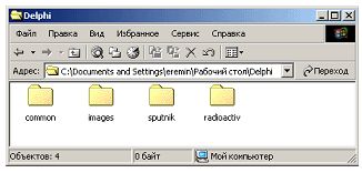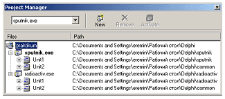 Рис. 3.14 На приведенном рисунке подготовлены папки для двух проектов (“Спутник” и “Радиоактивный распад”), обсуждавшаяся выше общая папка, а также папка для рисунков для управляющих кнопок и иконок (значков) проектов. Приведенная структура папок должна учитываться при сохранении модулей проектов. Примечание. Создание описанной выше структуры пакета может на первый взгляд показаться излишним. Существует простой альтернативный вариант — работать с каждым проектом отдельно, копируя во все папки общие файлы. Недостаток такого подхода состоит не столько в том, что напрасно продублированные общие файлы занимают место на диске; гораздо важнее, что неудобно вносить исправления в организованные таким образом проекты. В самом деле, представьте, что вы сделали незначительное исправление в модуле построения графиков. Тогда вам придется “растиражировать” исправленный модуль во все папки, загрузить каждый проект и его перекомпилировать. В то же время, при использовании описанной нами методики достаточно после указанного исправления модуля выбрать в меню пункт перекомпиляции всех проектов — и Delphi автоматически перекомпилирует сразу все проекты. Итак, мы подготовили необходимую структуру каталогов. Теперь остается создать связанные между собой проекты, используя предусмотренный для этой цели в Delphi специальный механизм project group (группы проектов). Учитывая, что данная возможность среды в учебной литературе обычно не раскрывается, расскажем подробнее, как с ним работать. Рассмотрение будем вести на слегка упрощенном примере: объединим всего два проекта. Запустим Delphi, и система обычным образом создаст одиночный проект, правда, предусмотрительно заготовив для него файл с проектной группой (иными словами, если не предпринимать специальных действий, то проектная группа получит стандартное имя ProjectGroup1 и будет состоять из единственного проекта; из сказанного понятно, почему на ней в простейших упражнениях не фиксируют внимания). Сначала сохраним проект в соответствии с разработанной нами структурой. Для этого выберем в меню пункт Save project as… и очень внимательно поработаем с диалогами сохранения файлов. Первый модуль, который является главным в данном проекте (для определенности “Спутник”), сохраним в индивидуальную папку: