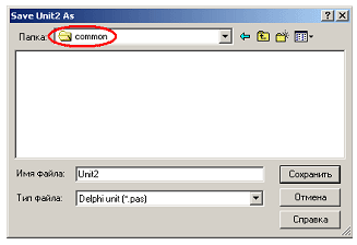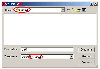 Рис. 3.15 Наиболее важные места диалога, на которые надо обязательно обратить внимание, на рис. 3.15 выделены. В частности, видно, что первый модуль сохраняется в папку sputnik. Подчеркнем, что для простоты имя модуля unit1, данное Delphi, можно оставить без изменения. Модуль unit2 (а также все последующие) сохраним в другую папку — common. Еще раз напомним читателям, что данная папка предусмотрена для хранения общей части проектов.