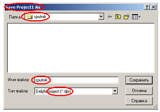 Рис. 3.16 Наконец, сохраним файл проекта, не забыв при этом дать ему нужное нам название sputnik (это стоит сделать, поскольку имя проекта присваивается скомпилированному exe-файлу).