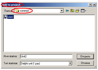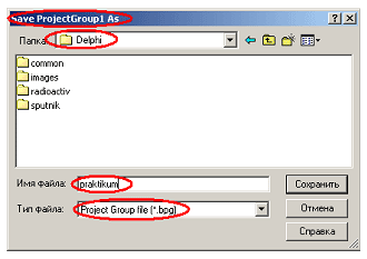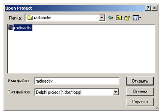 Рис. 3.19 Подчеркнем, что данный файл, который объединяет все проекты, целесообразно разместить на самом верхнем уровне иерархии папок нашего практикума. Теперь займемся вторым проектом. Снова запустим Delphi и подготовим второй проект. Его главный (уникальный для проекта) модуль unit1 сохраним описанным выше способом в папку radioactiv. А вот с остальными модулями придется действовать по-другому, так как они уже сохранены в общей части. Их надо подключить к проекту, воспользовавшись первым пунктом меню Project, который называется Add to Project (добавить к проекту).