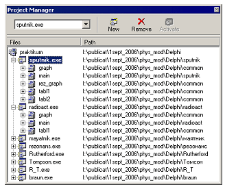 Рис. 3.23 Примечание. Delphi допускает создание нового проекта, “не выходя” из проектной группы, т.е. проект radioactiv можно было бы создавать, находясь непосредственно в praktikum. Эта процедура немного проще, чем та, которая была описана выше, но в этом случае нумерация форм нового проекта продолжает имеющуюся (например, первая форма получает имя Form6). Еще раз подчеркнем, что описанная нами процедура создания единого проекта есть не стремление “оригинальничать”, а вполне оправданный с точки зрения практического удобства подход. Именно в таком виде публикуемый пакет оказывается максимально открытым для расширения, позволяя творческим учителям легко дополнить его новыми физическими моделями. Устройство типичного проекта Теперь, когда стали понятны общие идеи построения программного обеспечения практикума, рассмотрим отдельно взятый проект моделирования одной из физических задач. В качестве такового выберем проект “Спутник”, включающий в себя все пять перечисленных в предыдущем разделе модулей. Большинство проектов практикума устроены совершенно аналогично, но есть и исключения: проект “Радиоактивный распад” в силу простоты своей математической постановки “обходится” всего тремя модулями. “Спутник”, как и любое Windows-приложение, будет состоять из окон. Для наших целей естественным образом напрашивается создание пяти окон: · главного с основными органами управления процессом численного моделирования (с ним ассоциируется программа вычислений для конкретной модели), · двух окон построения графиков: для каждого расчета и итогового · и двух окон с таблицами наиболее важных физических характеристик: в первое помещаются интегральные характеристики процесса в целом, а во второе — промежуточные числовые результаты расчетов по каждому из графиков. Возможный вид реализации виртуальной лабораторной среды приведен на рис. 3.24. Рассмотрим теперь подробнее программы на Паскале, ассоциированные с каждым из окон приложения.