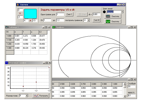 Рис. 3.24 Модуль 1. Main Начнем с главного окна, обеспечивающего основной пользовательский интерфейс, а также определяющего ход вычислений для модели “Спутник”. Если пропустить стандартную “шапку” описаний, которую Delphi генерирует автоматически, программа открывается блоком параметров, приспосабливающим универсальные общие модули к конкретной исследуемой модели. Поскольку эти параметры предназначены для остальных модулей, данное описание размещено в интерфейсной части главного модуля. {Блок параметров} const Nparam = 5; {число параметров в таблице} tabTitles: array [0..4] of string[2] = ('V0','e','T','a','k3'); tab2Tit='V0 \ t='; NZ1=6; NZ2=3; {десятичные знаки в таблице} neopred=-1000;{значение не определено и не отобразится в таблице} myScreenX=520; myScreenY=(3*myScreenX) div 4; {размеры графич. поля} Narg=0; Nfunc=2; {номера столбцов, по которым строится итоговый график} В открывающейся далее реализационной части основную часть занимает программа вычислений, имеющая для проекта “Спутник” следующий вид. var x,y,Vy,Vx,t,tp,a,v0,e,k3,dt:double; {физические величины} mnogo,myStop:boolean; {для регулир. количества графиков и останова} {ускорение} function ax(x,y,t:real):double; begin ax:=-x/(sqrt(x*x+y*y)*(x*x+y*y));end; function ay(x,y,t:real):double; begin ay:=-y/(sqrt(x*x+y*y)*(x*x+y*y));end; {начальные условия} procedure nachsost(Vnach:double); begin t:=0;x:=1;y:=0;Vx:=0;V0:=Vnach;Vy:=V0 end; {один шаг расчета и вызов визуализации} procedure trace; begin vx:=vx+ax(x,y,t)*dt; x:=x+vx*dt; vy:=vy+ay(x,y,t)*dt; y:=y+vy*dt; grPutPixel(x,y); end; {интегральные параметры траектории} procedure integr; begin param[1]:=e; param[2]:=tp; param[3]:=a; param[4]:=k3; tabLine; {сформировать строку в таблице} end; procedure buttons(b:boolean); begin {активация кнопок "Счет" и "Стоп" ("в противофазе")} with Form1 do begin BitBtn3.Enabled:=b; {"Стоп"} Button1.Enabled:=not b; {"Счет" - 1 график} Button2.Enabled:=not b; {"Счет" - много графиков} end; end; procedure graphic1(mnogo:boolean); var v1,v2,v3,vh,s,Xmin,Ymax,yold,xold,Tprint,tpr:double; i,n:integer; begin if mnogo then {много графиков} begin v2:=StrToFloat(Form1.Edit2.Text); {начало} v3:=StrToFloat(Form1.Edit3.Text); {конец} n:=Form1.ComboBox1.ItemIndex+2;{число траект.} vh:=(v3-v2)/(n-1);{шаг} v0:=v2;{нач. скорость} end else {1 график} begin v1:=StrToFloat(Form1.Edit1.Text); v0:=v1;{нач. скорость} n:=1;{1 траект.} vh:=0{шаг} end; Xmin:=StrToFloat(Form1.Edit4.Text);{левая граница графиков} Ymax:=StrToFloat(Form1.Edit7.Text);{верхняя граница графиков} dt:=StrToFloat(Form1.Edit8.Text); {шаг по времени} Tprint:=StrToFloat(form4.edit2.Text); myStop:=false; buttons(true); {активация кнопки "Стоп"} i:=1; {номер траектории} repeat {n траекторий} if v0<>0 then {V0=0 - не считает} begin ClearLastPoint; {сбросить коорд. последней точки} nachsost(v0);{начальные условия} e:=0; {T, a и K3 пока не определены} tp:=neopred; a:=neopred; k3:=neopred; tpr:=Tprint; s:=0; param[0]:=V0; repeat {расчет траектории} xold:=x;yold:=y;{запомнить коорд. пред. точки} t:=t+dt; trace; {шаг и визуализация} s:=s+(x*vy-y*vx); {площадь сектора} if (t>=tpr) then begin s:=0.5*s*dt; tpr:=tpr+Tprint; tab2AddValue(s); s:=0 end; if (xold>0)and(x<=0) then e:=abs(y-1); if (yold>=0)and(y<0)then {определить T, a и K3} begin tp:=2*t;a:=(1-x)/2; k3:=tp*tp/(a*a*a); end; {пауза для рисования} Application.ProcessMessages; until (((yold<0)and(y>0)){закончен оборот} or (((x<Xmin)or(y>Ymax))and(e>1))) {выход за пределы поля графика} or myStop; {нажата кнопка "Стоп"} integr; {интегральные параметры траектории} tab2NextLine; end; {if v0<>0} v0:=v0+vh; i:=i+1; {к следующей траектории} until (i>n) or myStop; {выход когда все траект. или по кнопке} buttons(false); {вернуть кнопки "Счет" и "Стоп" в исходное сост.} end; Ядром вычислительной части программы является процедура Graphic1. При значении параметра mnogo=false она рисует один график, а в противоположном случае — много, считывая начальное и конечное значения с соответствующих полей редактирования главного окна, а количество траекторий — из выпадающего списка. Аналогичным образом, с использованием стандартной функции Delphi под названием StrToFloat (строку в число с плавающей запятой), считываетс