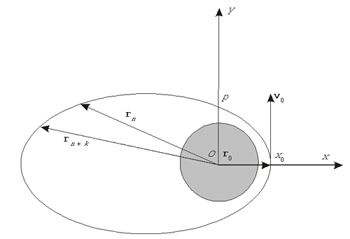 Рис. 5.1. Система координат и возможная траектория спутника Тогда начальные условия можно записать в виде: t = 0: x = x0, y = 0, vx = 0, vy = v0. (5.2) Уравнение (1) вместе с условиями (2) полностью определяют траекторию спутника и все ее свойства. Численная модель Численный анализ задачи удобно