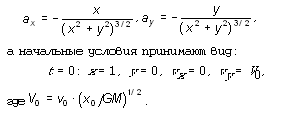 Все физические величины измеряются теперь в относительных единицах и будут одинаковыми для всех систем “спутник — притягивающий центр”. Уменьшилось также число параметров задачи. Единственный безразмерный параметр V0, который остался в задаче, показывает, как соотносятся между собой кинетическая и потенциальная энергии спутника в начальный момент. Действительно, кинетическая энергия спутника в начальный момент равна K = мv02/2, потенциальная энергия для ньютоновского закона тяготения равна П = GMm/x0, и V02 = 2K/П. Для нахождения в различные моменты