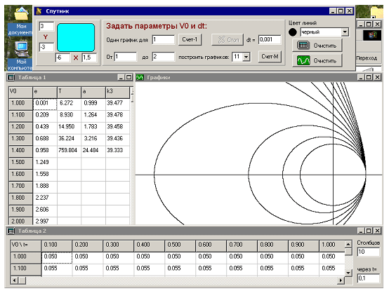в постановке задачи), В правой части главного окна есть еще три полезных органа управления: выпадающий список для выбора цвета рисования последующих траекторий и две кнопки очистки графического окна и значений в таблицах (они различаются по нанесенным на них пиктограммам). Все кнопки активны в процессе работы программы. Таким образом, описанные выше органы управления позволяют провести полное исследование физической модели спутника. Можно пробовать рисовать различные траектории и стирать их, подбирая именно те значения параметра, которые требуется найти в соответствии с целью исследования, в частности, в соответствии с поставленным учителем заданием. Окна с графиками функций и табл. 1 интегральных результатов для каждой траектории никаких органов управления не содержат. Зато для построения табл. 2 в правой части окна помещены два поля для ввода параметров построения данной таблицы. В первое вводится количество столбцов табл. 2, которое с точки зрения физического содержания задачи равняется числу точек траектории, для которых будет зафиксировано значение некоторой интересующей нас характеристики (в данной задаче это площадь сектора). Что касается второго поля, то в него задается значение времени, через которое эти значения будут заноситься в таблицу. Например, при указанных на рисунке значениях в таблицу для каждой траектории попадет по 10 точек для значений времени 0,1, 0,2, …, 1. В окне “Итоговый график” по двум колонкам табл. 1 “пузырьками” можно построить график функции. Номера колонок указаны в основном модуле программы. Построение графика осуществляется нажатием кнопки “Построить”. Другой кнопкой этого окна регулируется размер “пузырьков”. Обе кнопки активны в процессе всей работы программы. Эксперимент на модели в среде Delphi Проведем экспериментальное исследование движения спутника с помощью описанной выше модели. Для проведения численного эксперимента нужно прежде всего выбрать шаг по времени dt, с которым будем строить траекторию. По смыслу метода он должен быть достаточно малым, чтобы на этом интервале можно было пренебречь изменением ускорения при вычислении скорости и изменением скорости при вычислении новых координат. Шаг не должен быть и слишком маленьким, так как в этом случае для построения траектории потребуется большое время. Поскольку в качестве масштабов мы выбрали характерные параметры системы, то типичный временной интервал жизни системы равен 1. Малый интервал dt поэтому должен быть много меньше единицы; выберем его, например, равным 0,01. Второй параметр, который нужно задать, это начальная скорость. Опять, пользуясь тем, что расчет ведется в собственных масштабах задачи, для первого эксперимента естественно положить V0 = 1. Теперь можно построить одну траекторию, нажав кнопку “Счет-1”. Посмотрим на полученную траекторию. Она похожа на окружность, но не замкнулась при обороте спутника вокруг притягивающего центра (внутренняя кривая на графиках рис. 5.3). Это, по-видимому, связано с недостаточной точностью счета. Давайте уменьшим величину dt в два раза: dt = 0,005 и изменим цвет кривой. Экран и таблицы чистить не будем, чтобы сравнить результаты, полученные для разных dt. Нажимаем кнопку “Счет-1”. Результат лучше, но требуется еще более мелкий шаг. Сделаем dt = 0,001.