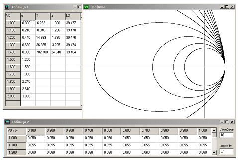 а период обращения — Теперь можно посмотреть, какие еще бывают траектории спутника. Построим серию траекторий из 11 линий с диапазоном начальных скоростей от 1 до 2. Очистим графическое поле и таблицу, наберем необходимые параметры и кнопкой “Счет-М” запускаем программу. На рис. 5.4 приведены результаты этого эксперимента. Видно, что с увеличением начальной скорости эллипсы вытягиваются вдоль оси х. Притягивающий центр (начало координат) находится в правом фокусе эллипсов. Последняя замкнутая траектория получилась для V0 = 1,4 (она так сильно вытянута, что не поместилась на экране). Для этой траектории эксцентриситет близок 1, а значит, соответствующая ей начальная скорость близка ко второй космической скорости. Анализ данных таблиц показывает, что второй и третий законы Кеплера хорошо выполняются.