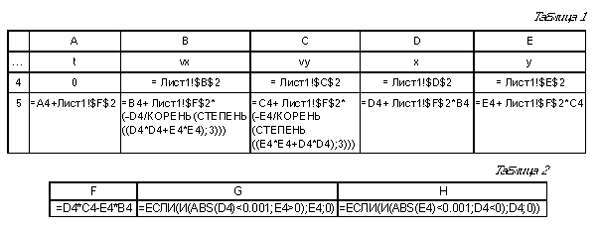 равный Для вычисления характеристик траектории и проверки законов Кеплера таблица значений дополнена тремя вспомогательными столбцами — F, G, H. В столбце F, начиная с первой строки таблицы, вычисляется комбинация проекций скорости и координат спутника для нахождения средней секториальной скорости на заданном промежутке времени. В столбце G с помощью функции ветвления ЕСЛИ и логического произведения И выделяются значения координаты y > 0 (столбец E4) в малой окрестности точки x = 0. Остальные ячейки столбца обнуляются. Таким образом, создается структура значений, позволяющая с помощью интервальной функции MAX найти приближенно координату точки, в которой траектория пересекает ось y, и вычислить эксцентриситет е. Аналогичная структура данных создается во вспомогательном столбце H для вычисления большой полуоси. При этом, поскольку выделяется малый диапазон отрицательных значений x, необходимо использовать функцию MIN. Соответствующие формулы приведены в табл. 2, являющейся фрагментом строки 4. Функции MIN и MAX используются в столбцах а и e таблицы результатов. Вычисления указанных характеристик производятся в таблице результатов, которая также включается в интерфейс. Период обращения определяется как значение ячейки A6280, когда получена замкнутая траектория. Среднее значение секториальной скорости, вычисленное путем усреднения формулы (9) для 20 точек в окрестности значений горизонтальной координаты, соответствующих максимальному и минимальному удалению от силового центра, помещается в раздел К2 таблицы результатов. Для реализации возможности сопоставления траекторий, соответствующих разным начальным состояниям, и проверки третьего закона Кеплера были созданы таблицы для двух траекторий, данные из которых представлялись на одной диаграмме (см. рис. 5.5). Таким образом, интерфейс представлял собой две строки параметров, две строки результатов обработки числовых данных и диаграмму с двумя графиками.