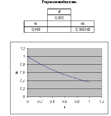 Рис. 5.5. Результаты эксперимента на модели MS Excel Примеры вопросов для самостоятельного решения 1. Какие в проведенных исследованиях получаются размерные первая и вторая космические скорости для спутника Земли? Ожидаемый ответ. Нужно вычислить единицу скорости для спутника у поверхности Земли: (GM/x0)1/2= (6,7 · 10-11м3/(кг · с2) · 6,0 · 1024 кг/(6,4 · 106 м))1/2 = 7,9 км/с. Для первой космической скорости это число нужно умножить на 1, а для второй — на 1,4. 2. Какие траектории спутника получатся, если начальная безразмерная скорость его меньше единицы? Ожидаемый ответ. Траекториями будут эллипсы с Землей в левом фокусе эллипса. Если начальная точка была недостаточно высоко над Землей, то траектория пересечет поверхность Земли, т.е. произойдет падение спутника на Землю. 3. Как изменятся значение площади, заметаемой радиус-вектором, и средняя секториальная скорость, если интервал времени, за который эти величины считаются, увеличить вдвое? В 5 раз? Ожидаемый ответ. Площадь увеличится в соответствующее число раз. Убедиться в этом можно, анализируя содержимое табл. 2 в разных экспериментах. Средняя секториальная скорость не изменится. Примеры заданий для самостоятельного исследования 1. Построить 11 траекторий для значений начальной скорости в диапазоне от 0,8 до 1,8. Используя режим расчета одиночной траектории, нанести на рисунок красным цветом круговую траекторию, а розовым — самую вытянутую траекторию, целиком уместившуюся на экране. 2. Произведите расчет для значений начальной скорости 0,4. Получилась ли траектория замкнутой? Как добиться, чтобы она стала замкнутой (уменьшить шаг по времени)? 3. Постройте 6 траекторий для значений начальной скорости в диапазоне от 1,4 до 1,42. Определите, сколько из них будут замкнутыми. Найдите в таблице значение большой полуоси для самой вытянутой замкнутой траектории. Попробуйте подобрать масштабы по осям x и y, чтобы эта траектория поместилась в окне графика. 4. Подобрать такую начальную скорость спутника, чтобы период его обращения T был вдвое больше, чем при обращении по круговой орбите. 5. Исследовать, как влияет величина шага по времени на значение константы третьего закона Кеплера для разных траекторий. Примечание. Количество траекторий при моделировании средствами MS Excel может быть уменьшено. 6. Закон естественного радиоактивного распадаПостроение модели явления естественного радиоактивного распада начнем с обсуждения основных свойств этого явления и постановки вопросов, на которые мы хотим получить ответы из численного эксперимента на модели. Прежде всего нужно сформулировать основные результаты натурных экспериментов. Эксперименты с тяжелыми атомами говорят, что их ядра распадаются, выбрасывая частицы и превращаясь в более легкие. Распад ядра происходит спонтанно и практически не зависит от внешних условий, в которых оно находится. Число распадов, регистрируемых в единицу времени, не зависит от внешних полей, концентрации радиоактивных атомов, химической структуры молекул, в которые входят радиоактивные атомы, а зависит только от числа атомов, ядра которых способны распадаться. Вероятность естественного распада ядра определяется его устройством и не зависит от того, что происходит вне ядра. Эта вероятность может быть описана некоторым числом, характерным для данных ядер. Таково главное свойство естественн