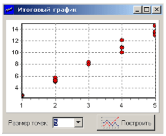 Рис. 3.9 К сожалению, ситуация принципиально не улучшаема, поскольку таков алгоритм выбора масштаба компонентом Chart: при расстановке точек он отображает пространство между “верхом самой верхней точки” и “низом самой нижней”, а они все на одной горизонтали. В итоге изменение размера точек приводит лишь к пересчету масштаба по оси ординат, а неудачный вид графика, когда всю его площадь занимают точки, сохраняется. Полный вид процедуры рисования графика с помощью компонента Chart приведен в распечатке модуля 5 (см. далее). Работа с таблицами в среде Delphi В Delphi предусмотрены специализированные компоненты для работы не только с графиками, но и с таблицами. Их использование существенно облегчает представление данных в табличной форме. Для целей моделирования физических задач требуется главным образом занесение данных в таблицу (самое сложное действие в нашем практикуме — последующее извлечение данных из таблицы для построения итогового графика, о чем шла речь в предыдущем разделе), так что предусмотренных в компонентах стандартных возможностей более чем достаточно. На странице Additional палитры компонентов Delphi имеются две “заготовки” для работы с таблицами — StringGrid и DrawGrid. Во второй компонент заложены некоторые дополнительные возможности (например, в его ячейках предусмотрен объект Canvas, а значит, там можно рисовать!), но они явно выходят за рамки наших потребностей, поэтому мы ограничимся более простой, чисто строковой “сеткой” StringGrid.