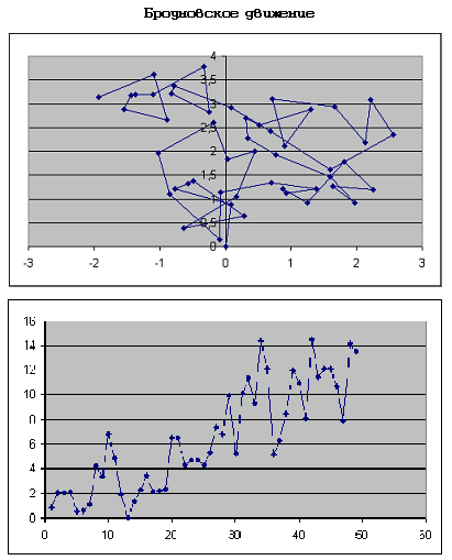 Рис.7.2. Зависимость среднегоквадрата смещения броуновской частицы от времени наблюдения Красные кружки отмечают четыре почти совпадающие линейные зависимости. Этот результат говорит о том, что средний квадрат смещения частицы за время Т пропорционален этому времени. Теперь можно провести наблюдение за движением большой серии частиц (по 10 траекторий), меняя и временной интервал выдачи положения частицы (правое нижнее окно табл. 2). Добавленные точки на итоговом графике подтверждают установленную ранее закономерность. Примеры вопросов для самостоятельного решения 1. Как часто броуновская частица возвращается назад к началу координат, т.е. расстояние до начала координат в фиксируемый момент времени оказывается меньше, чем в предыдущий? Ожидаемый ответ: Подсчет возвратов частицы в табл. 2 показывает, что они составляют около одной третьей части и случаются нерегулярно. Примеры заданий для самостоятельного исследования 1. Проведите серию экспериментов с разными L (по смыслу это соответствует разным температурам жидкости, в которой взвешена броуновская частица). Табл. 1 чистить не будем, чтобы сохранить полученные точки на итоговом графике, а поле для построения траекторий удобно чистить после каждой серии. Проведите сразу несколько серий расчетов по 10 траекторий и постройте итоговый график. Экспериментальные точки должны группироваться около прямых с разным наклоном. 2. В главном окне показан меняющийся параметр N, который определяет количество обращений к датчику случайных чисел. При N = 1 для расчета одного шага броуновской частицы используется равномерное распределение, для больших N это распределение переходит в распределение Гаусса (чем больше, тем лучше). Определите, влияет ли значение параметра N на зависимость среднего квадрата смещения броуновской частицы от времени наблюдения. 3. Проследите зависимость среднего квадрата смещения от L. Для этого выпишите значения s2 для разных L и одинаковых значений Т и постройте зависимость s2 от L. Эксперимент на модели в среде MS Excel Общая структура данного проекта соответствует той, что описана во введении. В качестве результатов представлены положения броуновской частицы в последовательные моменты времени, при условии, что в начальный момент времени частица находилась в начале координат. Для определения ее положения в последующие моменты времени использовался встроенный датчик случайных чисел с диапазоном (–1, 1). На второй диаграмме представлена зависимость от времени квадрата расстояний от начальной точки до текущего положения частицы. Видно, что в среднем это расстояние растет со временем. В качестве самостоятельного задания можно предложить рассмотреть разные реализации, пересчитывая значения, помещенные в таблицу.