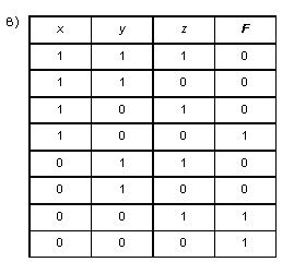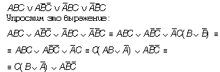 Для решения задачи необходимо записать логический многочлен (конъюнктивный или дизъюнктивный), имеющий в качестве своей таблицы истинности заданную, а затем построить соответствующую ему логическую схему. Чаще всего полученный многочлен предварительно упрощают с целью минимизации количества используемых логических элементов. Очевидно, что поскольку предполагаются лишь эквивалентные преобразования, то результирующая схема будет эквивалентна той, которая была бы построена по исходному логическому выражению и, таким образом, будет соответствовать условию задачи. Анализируя таблицу истинности, замечаем, что количество нулей и единиц в результате (значения переменной F) одинаково, поэтому выбор конкретного способа построения может быть любым. Выберем дизъюнктивный многочлен. Получаем (для сокращения записи знак конъюнкции пропущен, отрицание переменной обозначено горизонтальной черточкой сверху):