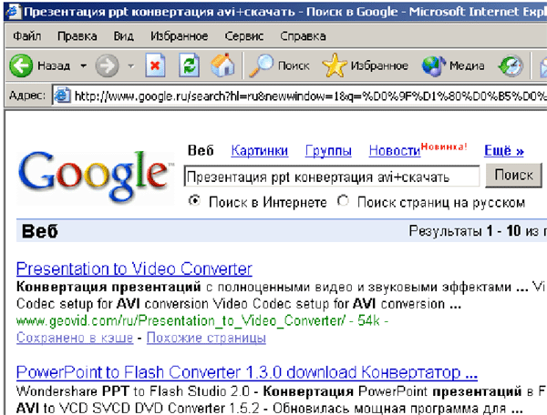 Например, необходимо найти программное обеспечение для конвертирования презентаций PowerPoint в формат avi. Возможный вариант запроса “Презентация ppt конвертация avi+скачать”.