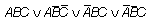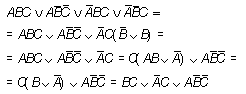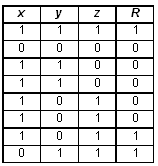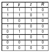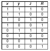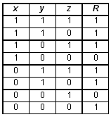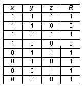 Решение. При составлении логического выражения по заданной таблице истинности можно составить либо конъюнктивный многочлен (представляющий собой конъюнкции дизъюнктивных одночленов) — если значения формулы преимущественно равны 1; либо дизъюнктивный многочлен (представляющий собой дизъюнкции конъюнктивных одночленов) — если значения формулы преимущественно равны 0. Так как в заданной таблице значения логического выражения F по количеству 0 и 1 совпадают, то возможен выбор любого варианта действий. Построим дизъюнктивный многочлен. Для этого выбираем те строки, где значения выражения равны 1, и для каждой из них строим конъюнктивный одночлен, который будет истинным только для данной строки и ложным для всех остальных; построенные одночлены объединим с помощью дизъюнкции. В результате получаем: