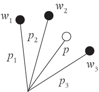 Для большей определенности задачи потребуем, чтобы края карт были параллельны краю стола, — в противном случае величину выступа можно было бы увеличить, разворачивая карты так, чтобы их уголки выступали немного дальше. А для того чтобы упростить ответ, предположим, что длина каждой карты равна 2 единицам. Для одной карты максимальная величина выступа получается тогда, когда ее центр тяжести находится ровно над краем стола (будем считать, что в этом случае равновесие будет устойчивое). А поскольку центр тяжести находится в центре карты, то мы можем образовать выступ длиной в половину карты, т.е. длиной в 1 единицу. Для двух карт нетрудно убедиться, что максимальная величина выступа получается тогда, когда центр тяжести верхней карты находится ровно над краем второй карты, а общий центр тяжести обеих карт — ровно над краем стола. А поскольку общий центр тяжести двух карт будет находиться посередине их совмещенных частей, то мы в состоянии увеличить величину выступа еще на пол-единицы. Подобные обстоятельства подсказывают общий метод, в соответствии с которым карты помещаются так, чтобы центр тяжести k верхних карт находился ровно над краем (k + 1)-й карты (которая положена под эти k верхних карт). Стол же играет роль n + 1-й карты. Для того чтобы выразить это условие алгебраически, можно обозначить через dk расстояние от выступающего края самой верхней карты до соответствующего края k-й сверху карты (см. рис. 1). Надо также вспомнить уроки физики. Из них читателю, очевидно, известно, что центр тяжести k предметов, которые имеют веса w1, w2, …, wk и центры тяжести которых находятся соответственно в точках p1, p2, …, pk (см. рис. 2), расположен в точке p = (w1p1 + w2p2 + … + wkpk)/(w1 + w2 + … + wk). Это означает, что для двух карт можем записать: