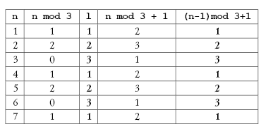 Остатки от деления на 3 лежат в диапазоне 0..2, а искомый результат — 1..3. Значит, прибавление 1 к остатку переведет числа в требуемый диапазон. Но тогда каждые 3 последовательных результата оказываются циклически сдвинутыми на единицу относительно правильного ответа. Поэтому остаток от деления на 3 надо брать не от числа n, а от числа n – 1, что и приводит нас к желаемому результату. Составление подобных таблиц полезно и при решении других задач.