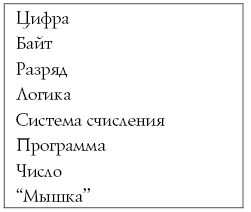 Рис. 5 Конечно, вы уже поняли, в чем секрет фокуса и как его демонстрировать. Единственная трудность — запомнить номера 15 слов (словосочетаний). При оформлении таблички на рис. 1 использованы некоторые приемы, облегчающие запоминание. Например, слова бит и байт даны соответственно под номерами 1 и 8 (1 байт = 8 битов), номер 13 (“несчастливое” число) связано со словом число, а перед ним, под номером 12, приведено слово цифра. Размер дискеты равен 3,5 дюйма, и слово дискета дано под номером 3. В жизни (не считая уроков информатики) мы пользуемся десятичной системой счисления, поэтому словосочетание система счисления дано под номером… — правильно, 10! |