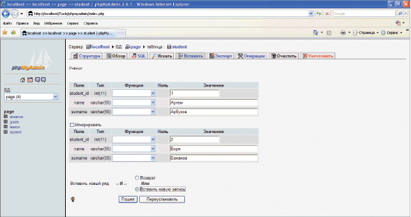 данных “Страница школьного журнала”. |
