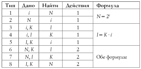 Возможны следующие сочетания известных (Дано) и искомых (Найти) величин. В третьем столбце показано, сколько действий необходимо выполнить для определения неизвестной величины по формулам (без перевода в другие единицы измерения информации).