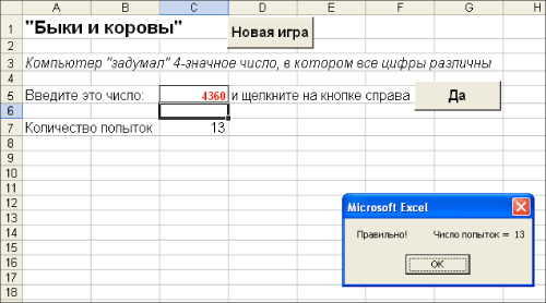Игра "Быки и коровы" в среде Microsoft ExcelКто сам пилит свои дрова, тот согревается дважды3. Кто сам программирует свои