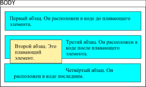 Плавающий элемент может выйти за пределы своего контейнера только в том случае, если для него (плавающего элемента) задан отрицательный внешний отсту 3.1.1.3. Позиция по вертикали Положение верха плавающего элемента определяется по более сложному алгоритму и зависит от того, был элемент строчным или блочным до того, как стал плавающим. 3.1.1.3.1. Элемент был блочным Сначала исследуем поведение плавающего элемента, который был блочным. Пусть страница задана следующим кодом. HTML-код: <BODY> <P>Первый абзац. Он расположен в коде до плавающего элемента. <P class=float>Второй абзац. Это плавающий элемент. <P>Третий абзац. Он расположен в коде после плавающего элемента. <P>Четвертый абзац. Он расположен в коде последним. </BODY> CSS-код: BODY { padding:0; margin:0;} P /* Правила для всех абзацев */ { background:cyan; padding:10px; margin:10px; border: 1px solid black; } P.float /* Дополнения для абзаца float */ { float:left; width:160px; background:#fff2a6; } Верх плавающего элемента занимает такое место, которое оно имело бы в потоке, за исключением одного момента: внешние отступы плавающего элемента не схлопываются (см. 1.2.2). Видим на иллюстрации, что расстояние от границы плавающего блока до границы первого абзаца равно не 10 пикселей, а 20. Внешний отступ первого абзаца (10 пикселей) сложился с внешним отступом плавающего блока (10 пикселей).