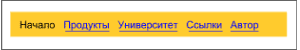 Посмотреть (плавающие блоки/плавающая врезка/шаг 1). Врезка размещается в блоке incut , который объявлен плавающим. Ширина врезки указана в em , но можно было задать значение в процентах (например, width:30% ). Фокус с display:inline (см. 3.1.1.3.1) для IE не потребовался, потому что внешний отступ справа у блока incut задан нулевым, для выравнивания его справа по одной вертикали с остальным содержимым BODY . 3.2.2. Горизонтальное менюИспользуя свойство float, построим горизонтальное меню сайта. Меню — это список. Поэтому логично записать его в виде UL : <UL class="menu"> <LI><SPAN>Начало</SPAN> <LI><A href="01.htm">Продукты</A> <LI><A href="02.htm">Университет</A> <LI><A href="03.htm">Ссылки</A> <LI><A href="04.htm">Автор</A> </UL> Пункт, который не является ссылкой, обернут элементом SPAN , чтобы можно было формулировать для него стилевые правила (как для A в других пунктах).