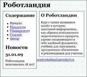 Соответственно, HTML-код изменится следующим образом: <BODY> ... <!-- Боковая панель --> <DIV id="sidebar"> <H2>Содержание</H2> <DIV class="wrapper"> ... </DIV> <!-- Конец wrapper --> <H2>Новости</H2> <DIV class="wrapper"> ... </DIV> <!-- Конец wrapper --> </DIV> <!-- Конец sidebar --> <!-- Содержание --> <DIV id="content"> <H2>О Роботландии</H2> <DIV class="wrapper"> ... </DIV> <!-- Конец wrapper --> </DIV> <!-- Конец content --> ... </BODY> Опишем правки, выполненные в стилевых определениях в связи с удалением внутренних отступов в sidebar и content и введением оберточного блока wrapper. Правок немного.