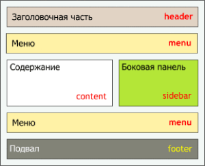Заметим, что блоки меню помечены классом class="menu" , а не идентификатором, так как идентификатор может быть на странице только один (см. 2.1.1). Оборачивая с одержимое блоков content и sidebar в дополнительные DIV'ы, мы нарушаем правило “в HTML не место визуальным конструкциям”. Но трюки с блочной моделью — тоже плохо. Увы, мы живем не в идеальном мире, и рафинированный подход не всегда является правильным (и даже возможным). Если мы позволили себе использовать обертку wrapper ради создания ложных колонок, то нелогично отказываться от дополнительных DIV 'ов, упрощающих создание отступов, взывая к структурной чистоте HTML (см. 3.3.11). 3.3.2. Без CSS Вот так это выглядит в потоке. Горизонтальные линии <HR class="none"> введены для улучшения восприятия страницы в браузерах без CSS, мы так уже делали (см. 2.4.3) при построении сайта Роботландии. Для класса none будет определено свойство display:none , которое удалит линии с экрана в браузерах с поддержкой стилевых таблиц.
