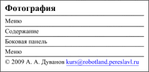 3.3. Пример (разработка сайта “Фотография”)Построим сайт, посвященный делу, к которому Роботландия давно стремится, но за чередой других забот никак не находит времени им заняться, — фотографии! Этапы разработки: · 3.3.1. Набросок результата и блочный макет· 3.3.2. Без CSS· 3.3.3. Выбираем модель и задаем геометрию· 3.3.4. Заголовок· 3.3.5. Меню· 3.3.6. Боковая панель· 3.3.7. Наполняем содержимым главную страницу· 3.3.8. Инварианты· 3.3.9. Галерея работ· 3.3.10. Результат· 3.3.11. Неидеальные итогиЕсли вам не терпится посмотреть, что получится, пожалуйста: посмотреть (плавающие блоки/сайт “Фотография”/шаг 8). Работают все ссылки в главном (горизонтальном) меню и ссылка “Портрет” на боковой панели. Результат немного отличается от первоначальной задумки, но это и неудивительно! Ведь в процессе работы над проектом понемногу меняются и представления о нем. 3.3.1. Набросок результата и блочный макетПрикинем страницу сайта в графическом редакторе, изобразим упрощенный блочный макет и запишем для него скелетный HTML: <BODY> <DIV id="header">Заголовок</DIV> <DIV class="menu">Меню</DIV> <DIV id="wrapper"> <DIV id="content"> <DIV сlass="wrap">Содержание</DIV> </DIV> <DIV id="sidebar"> <DIV class="wrap">Панель</DIV> </DIV> </DIV> <DIV class="menu">Меню</DIV> <DIV id="footer">Подвал</DIV> </BODY> Обертка wrapper позволит создать ложные колонки (см. 3.2.3), а блоки <DIV class="wrap"> (дополнительно оборачивающие содержимое блоков content и sidebar ) сделают ненужным трюк для IE с блочной моделью (см. 3.2.3).