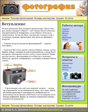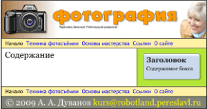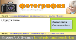 Посмотреть (позиционирование/сайт “Роботландия”/шаг 4). Зададим и для блока footer левый внешний отступ в 15em, чтобы он не путался под ногами у sidebar:/* Подвал */ #footer { margin-left: 15em; padding: 0.5em; } Ну вот: основные дела сделаны! Теперь можно попить чаю с сухариками, а затем продолжить начатую работу. 2.5. Продолжение 1Продолжаем построение сайта на базе типового двухколонного макета (начало построения — в разделе 2.4).