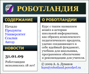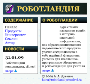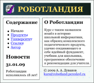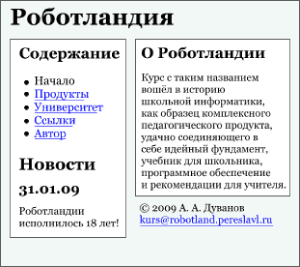 Каждый элемент A, соответствующий внешней ссылке, снабжается классом off. Можно было бы вообще обойтись без задания класса, используя определение: /* Оформление внешней ссылки */ A[href^="http://"] { background: url(pic/off.gif) no-repeat center right; padding-right: 11px; margin-right: 2px; zoom:1; } Селектор A[href^="http://"] указывает на все элементы A, у которых значение атрибута href начинается с http://. К сожалению, IE6 этой премудрости (в отличие от других браузеров) не понимает. 2.6.3. Инварианты страницыИспользуя CSS, мы отделили визуальный образ сайта от его содержания и поместили все стилевые определения в отдельный файл main.css. Этот файл будет подключаться к страницам при помощи указания, расположенного в головной части каждого HTML-файла: <STYLE type="text/css">@import url(main.css);</STYLE> Теперь, если мы захотим что-то изменить в визуальном образе сайта, нам не придется вносить правки в многочисленные файлы HTML, мы будем работать с единственным файлом main.css, и эти правки автоматически скажутся на всех страницах сайта. Очень хорошо, но… Что делать, если мы решим добавить в меню еще один пункт? Освежить новости, сменить логотип, исправить контактную информацию? Увы, придется выполнять одни и те же правки во всех HTML-файлах. Эта печальная перспектива наводит на счастливую мысль выделить все инварианты сайта в один JavaScript-файл и все правки выполнять только в нем, не прикасаясь к файлам HTML. Мы так уже делали при построении меню на вкладках в разделе “1.6.5. Подключаем JavaScript”. Проделаем и здесь аналогичную работу. 2.6.3.1. Подвал Начнем с самого простого инварианта — подвала. Сейчас этот фрагмент кода выглядит так (заодно отнесли к нему и горизонтальную прямую, которая показывается без CSS): <HR class="none"> <!-- Подвал --> <DIV id="footer"> © 2009 А. А. Дуванов <A href="mailto:kurs@robotland.pereslavl.ru"> kurs@robotland.pereslavl.ru</A> </DIV> <!-- Конец footer --> Создадим функцию PutFooter, которая будет формировать этот код и выводить его на экран: // Подвал function PutFooter() { var str = '<HR class="none"><DIV id="footer">'; str += '© 2009 А. А. Дуванов <A ' + 'href="mailto:kurs@robotland.pereslavl.ru"> kurs@robotland.pereslavl.ru </A>'; str += '</DIV>'; document.write(str); } Эту функцию мы поместим в файл main.js, а в HTML внесем следующие правки: Было: <HR class="none"> <!-- Подвал --> <DIV id="footer"> © 2009 А. А. Дуванов <A href="mailto:kurs@robotland.pereslavl.ru"> kurs@robotland.pereslavl.ru </A> </DIV> <!-- Конец footer --> Стало: <!-- Подвал --> <SCRIPT language="JavaScript" type="text/javascript"> <!-- PutFooter(); //--> </SCRIPT> Не забудем подключить main.js к HTML-файлу: <!DOCTYPE HTML PUBLIC "-//W3C//DTD HTML 4.01 Transitional//EN" "http://www.w3.org/TR/html4/loose.dtd"> <HTML lang="ru"> <HEAD> <META http-equiv="Content-Type" content="text/html; charset=windows-1251"> <META http-equiv="imagetoolbar" content="no"> <META http-equiv="author" content="А.Дуванов"> <META name="keywords" content="Роботландия, Роботландский университет"> <META name="description" content="ПМК для школ, сетевое обучение."> <META http-equiv="Content-Style-Type" content="text/css"> <STYLE type="text/css">@import url(main.css);</STYLE> <SCRIPT language="JavaScript" type="text/javascript" src="main.js"></SCRIPT> <TITLE>Роботландия</TITLE> </HEAD> 2.6.3.2. Заголовочная часть Функция PutHeader будет формировать код заголовочной части и выводить его на экран. У функции будет параметр page — номер текущей страницы. Для всех страниц, кроме главной (для которой page равен нулю), логотип должен быть ссылкой на главную страницу: // Заголовочная часть // page=0 для главной страницы function PutHeader(page) { var str = '<DIV id="header"><H1>'; if (page) str += '<A href="index.htm">'; str += '<IMG src="pic/logo.png" border=0 width=72 height=69 alt="Логотип" title='; str += page ? '"На главную">' : '"Логотип Роботландии">'; if (page) str += '</A>'; str += ' Роботландия' str += '</H1></DIV><HR class="none">'; document.write(str); } Было: <!-- Заголовочная часть --> <DIV id="header"> <H1> <IMG src="pic/logo.png" width=72 height=69 alt="Логотип Роботландии" title="Логотип Роботландии"> Р
