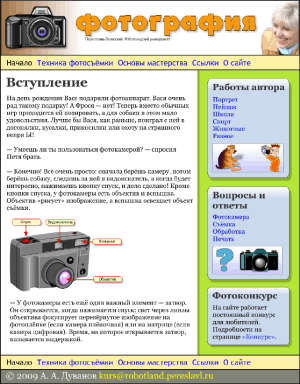 Посмотреть (плавающие блоки/сайт “Фотография”/шаг 6). 3.3.8. ИнвариантыТак же, как это было сделано при построении сайта “Роботландия” (см. 2.6.3), выделим постоянные части страниц в отдельный файл JavaScript. Для главной страницы получается такой HTML: <!DOCTYPE HTML PUBLIC "-//W3C//DTD HTML 4.01 Transitional//EN" "http://www.w3.org/TR/html4/loose.dtd"> <HTML lang="ru"> <HEAD> <META http-equiv="Content-Type" content="text/html; charset=windows-1251"> <META http-equiv="imagetoolbar" content="no"> <META name="keywords" content="Фотография, Роботландский университет"> <META name="description" content="Сайт РУ, посвященный фотографии."> <META http-equiv="author" content="А.Дуванов"> <META http-equiv="Content-Style-Type" content="text/css"> <STYLE type="text/css">@import url(main.css);</STYLE> <SCRIPT language="JavaScript" type="text/javascript" src="main.js"></SCRIPT> <TITLE>Фотография</TITLE> </HEAD> <BODY> <SCRIPT language="JavaScript" type="text/javascript"> PutHeader(0); // Заголовочная часть PutМеню(0); // Меню </SCRIPT> <DIV id="wrapper"> <DIV id="content"> <DIV class="wrap"> <H2>Вступление</H2> <P> ... </DIV> </DIV> <SCRIPT language="JavaScript" type="text/javascript"> PutSizebar(-1); // Боковая панель </SCRIPT> </DIV> <SCRIPT language="JavaScript" type="text/javascript"> PutМеню(0); // Меню PutFooter(); // Подвал </SCRIPT> </BODY> Поясним, что делает каждая функция, замещающая фрагмент HTML-кода. 3.3.8.1. ПодвалФункция PutFooter — самая простая. Она собирает в строку str HTML-код подвала и выводит его на экран при помощи метода document.write: // Подвал function PutFooter() { var str = '<HR class="none"><DIV id="footer">'; str += '© 2009 Роботландский университет, А. А. Дуванов: <A ' + 'href="mailto:kurs@robotland.pereslavl.ru" str += '</DIV>'; document.write(str); } Отметим, что в код подвала добавлен элемент HR для браузеров, которые не поддерживают CSS. Браузеры с CSS этот элемент проигнорируют благодаря свойству display:none, указанному в определении класса none. 3.3.8.2. Заголовочная частьФункция PutHeader обеспечивает вывод заголовочной части страницы. Любое значение параметра page, отличное от нуля, делает логотип ссылкой на главную страницу. Кроме того, на главной странице атрибут title будет иметь значение "Логотип сайта Фотография", на остальных — "На главную". // Заголовочная часть // page=0 для главной страницы function PutHeader(page) { var str = '<DIV id="header"><H1>'; if (page) str += '<A href="index.htm">'; str += '<IMG id="logo" src="pic/logo.png" width=160 height=112 alt="Логотип" border=0 title='; str += page ? '"На главную">' : '"Логотип сайта Фотография">'; if (page) str += '</A>'; str += '<IMG id="title" src="pic/title.png" width=468 height=72 alt="Фотография" title="Фотография">'; str += '</H1></DIV>'; document.write(str); } 3.3.8.3. Главное менюФункция PutМеню вызывается в HTML два раза: один раз в начале страницы, другой — в конце. Если значение параметра page совпадает с индексом страницы по массиву ItemsMenu, соответствующая позиция в меню будет обычным текстом (не ссылкой). Когда значение параметра page выпадает из диапазона индексов этого массива (например, page равно -1), все пункты меню будут кодироваться как ссылки. Такой вариант необходим для страниц, которые вызываются по ссылкам из боковой панели. // Главное Меню // Пункты меню // ----------- var ItemsMenu = [ ["Начало", "index.htm"], ["Техника фотосъемки", "01.htm"], ["Основы мастерства", "02.htm"], ["Ссылки", "03.htm"], ["О сайте", "04.htm"] ]; // Построение меню // page -- номер текущей страницы (нумерация с нуля) // Если page = -1, все позиции в меню ссылки function PutМеню(page) { var str = '<HR class="none"><UL class="menu">'; for (var i = 0; i < ItemsMenu.length; i++) { str += '<LI>'; if (i != page) str += '<A href="' + ItemsMenu[i][1] + '">'; str += ItemsMenu[i][0]; if (i != page) str += '</A>'; str += '</LI> '; // Пробел устраняет дублирование символов в IE6 } str += '</UL>'; document.write(str); } Пробел после закрывающего тега </LI> пришлось добавить, так как без него браузеру IE6 становится плохо, и он дублирует последнюю букву в отдельную строку на конце страницы, как это уже описывалось ранее (см. 3.3.3). Вы можете убрать этот пробел и посмотреть, что получится. О п